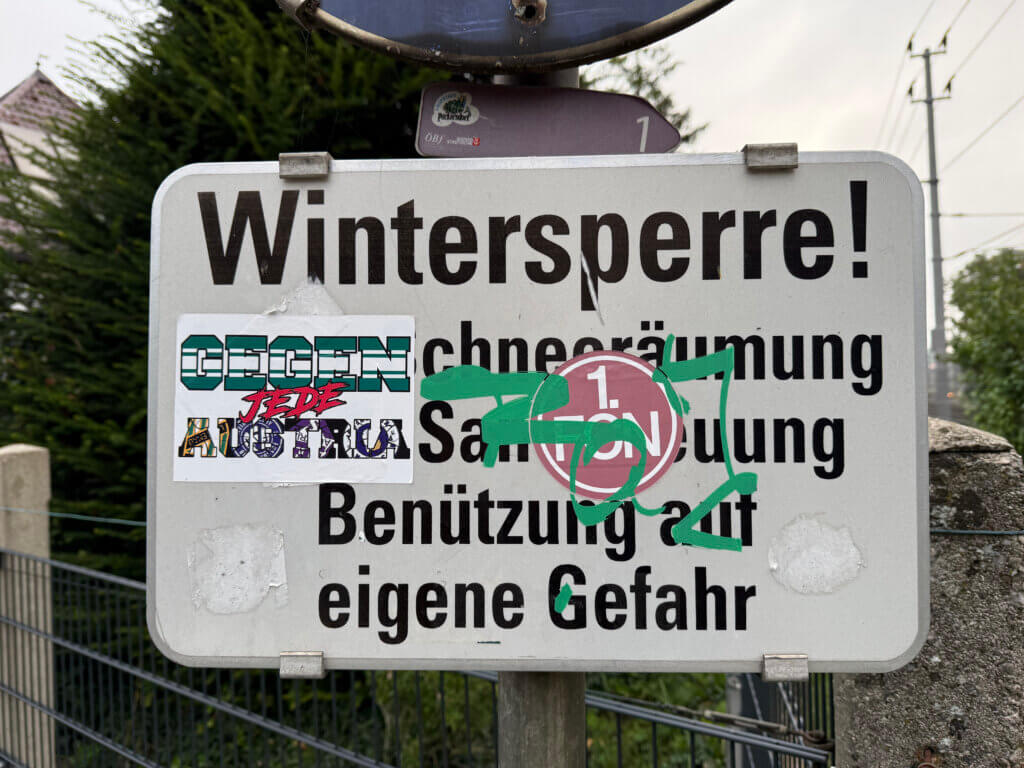 Wintersperre war gestern, Hinweisschild „Gegen jede Austria“ zeigt nun an, wohin die Reise geht